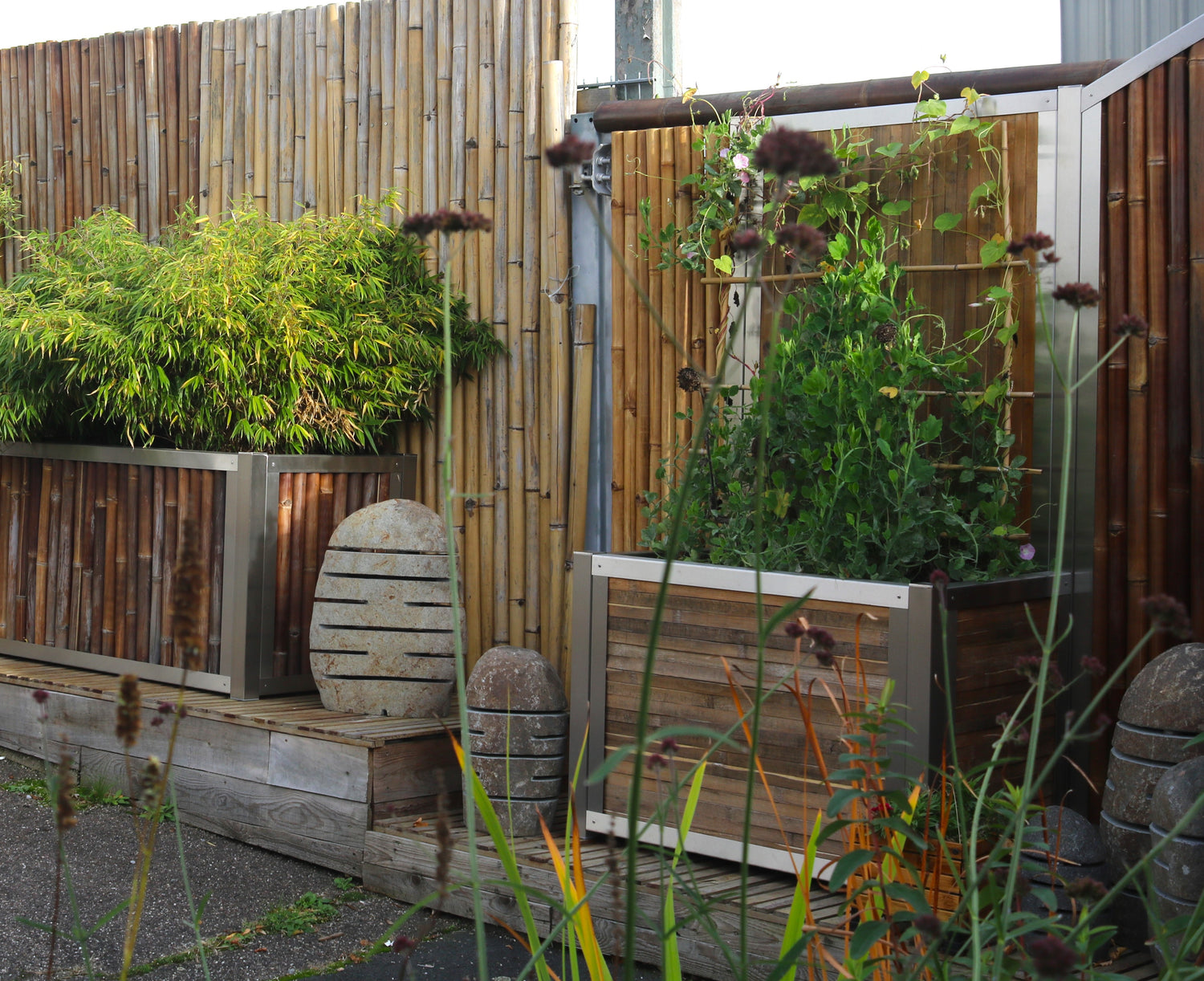 Avec une combinaison de brise-vue et de lit surélevé en bambou et acier inoxydable, vous pouvez créer un espace extérieur privé et décoratif. Passez du temps à prendre soin de vos plantes et à en profiter tout en étant entouré de la beauté naturelle du bambou et du style intemporel de l'acier inoxydable. Laissez-vous inspirer par la combinaison pratique et élégante et créez votre propre espace extérieur privé.